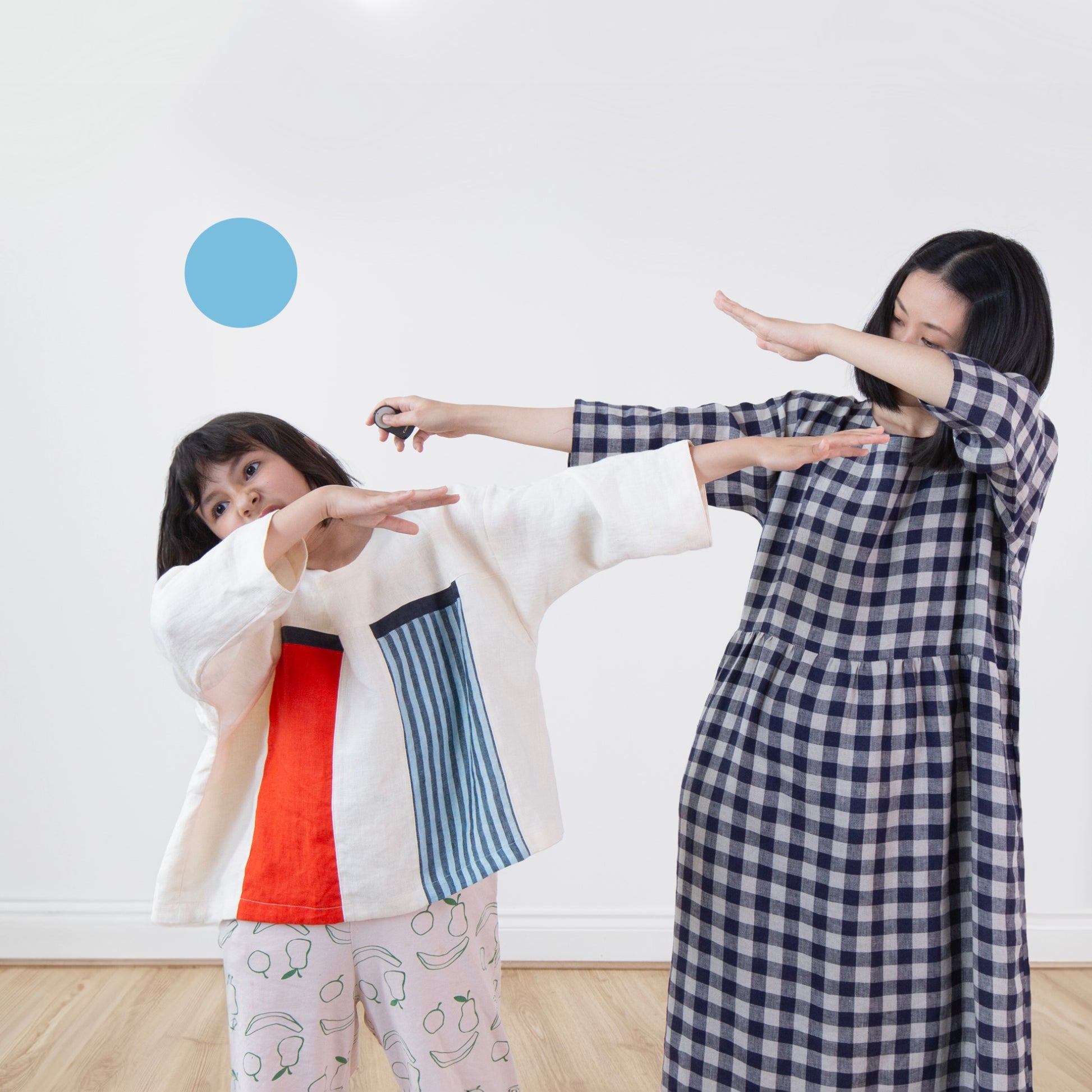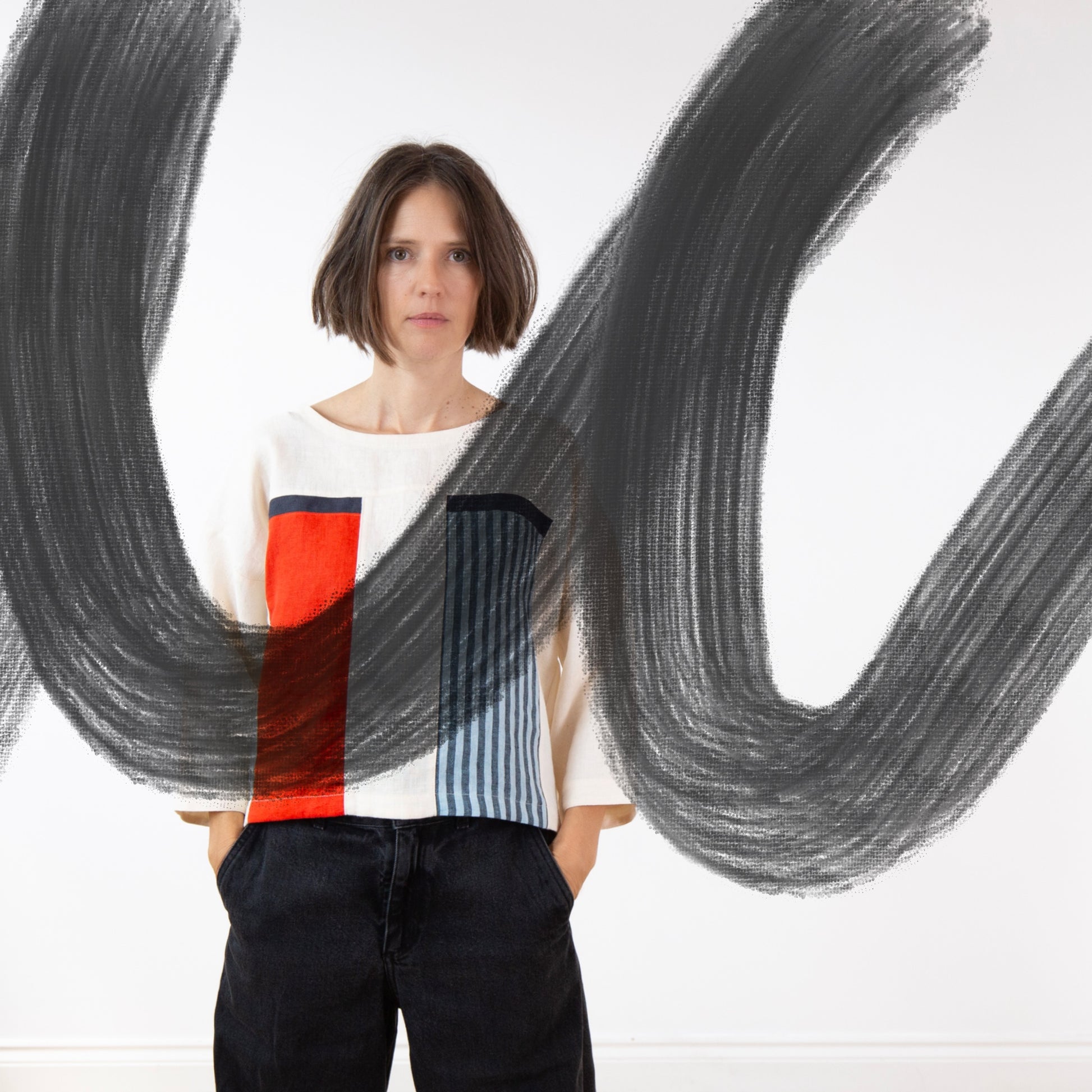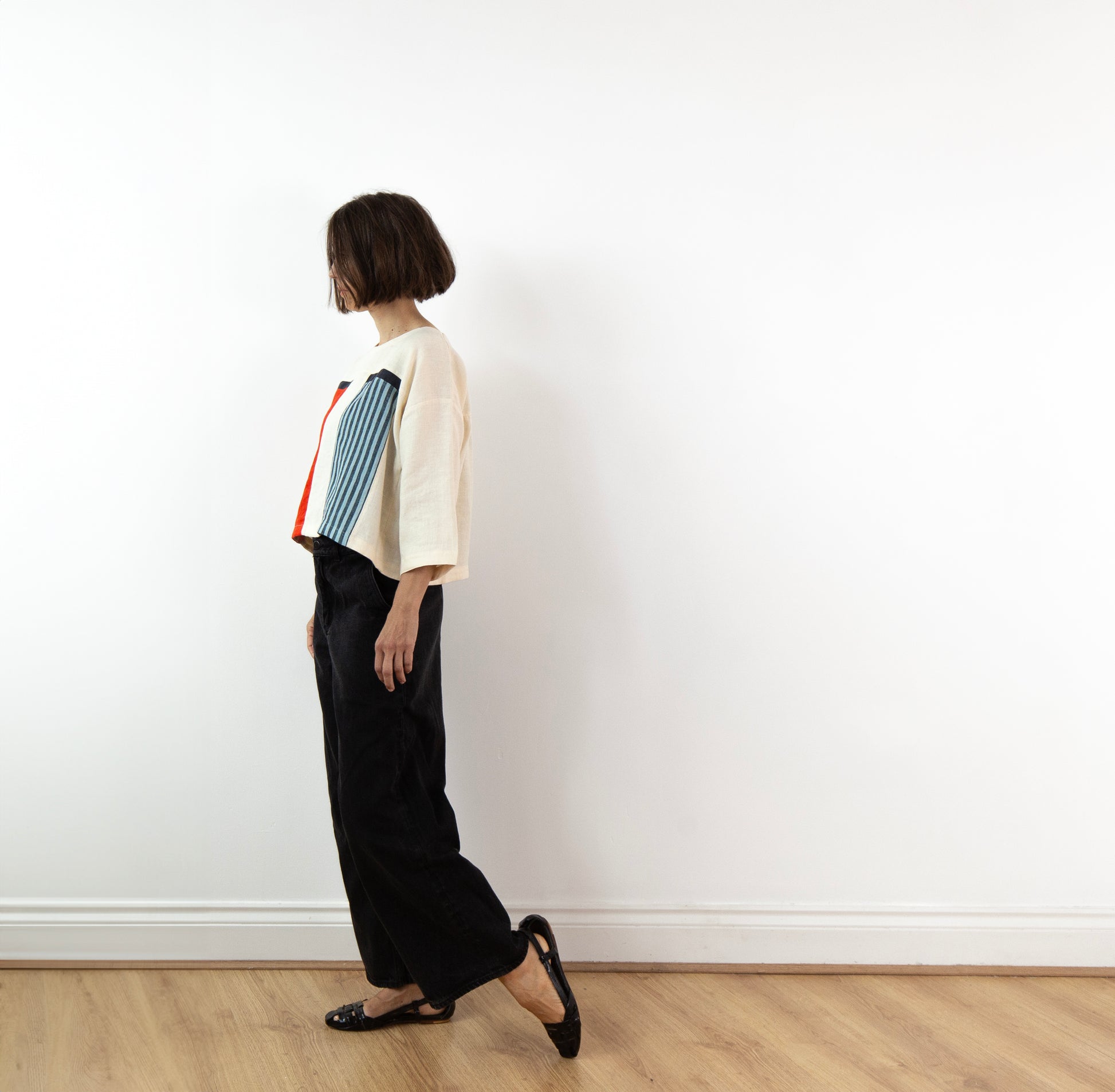 Linen tops play with colours and shapes inspired by French Post-Impressionism artist Pierre Bonnard. This top features a cropped design, easy oversized cut with dropped shoulders. 3/4 length sleeves. Medium weight fabrics.
