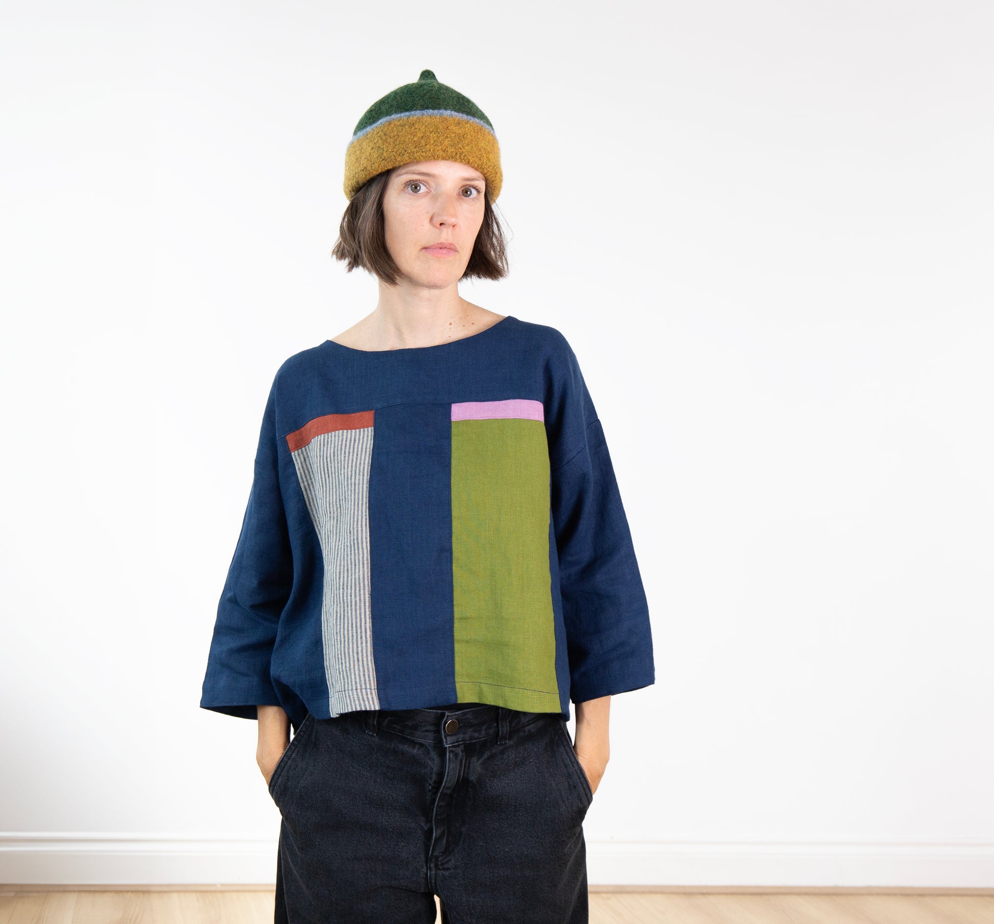 Linen tops play with colours and shapes inspired by French Post-Impressionism artist Pierre Bonnard. This top features a cropped design, easy oversized cut with dropped shoulders. 3/4 length sleeves. Medium weight fabrics.