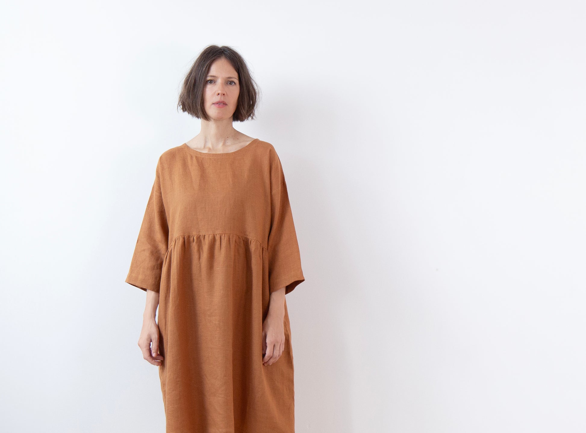 Supple and mid-weight Lithuanian linen. Easy oversized cut with dropped shoulders. 3/4 length sleeves. Fine gathers at waist and side pockets. Knee length.
