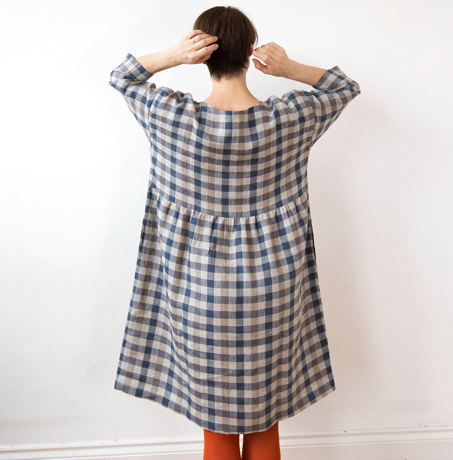 Supple and smooth gingham check linen. Easy oversized cut with dropped shoulders. 3/4 length sleeves. High waist design with light gathers and side pockets. Knee length.