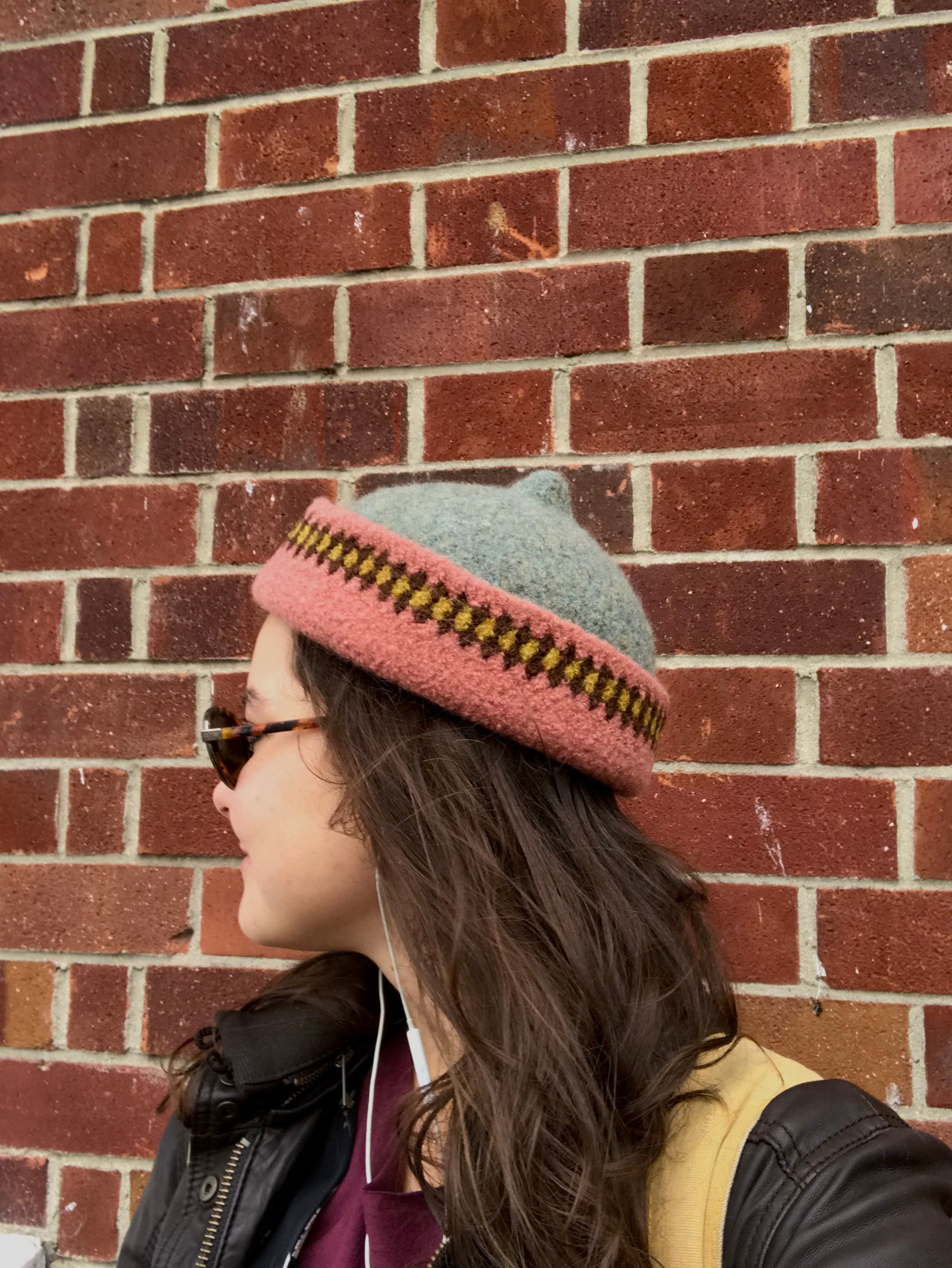 Beautiful handmade wool hat by textile artist Chloe Sendall from Sussex, a historical county of southeastern England. 100% Peruvian Highland Wool, solid and warm.
